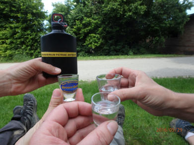 Eine Flasche gefüllt mit Schnaps wurde uns übergeben. 2 Aufgaben sind damit verbunden:1. Sie zügig zu leeren2. Sie mit Aufklebern unserer Stationen zu verzieren.