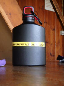 Eine Flasche gefüllt mit Schnaps wurde uns übergeben. 2 Aufgaben sind damit verbunden:1. Sie zügig zu leeren2. Sie mit Aufklebern unserer Stationen zu verzieren.