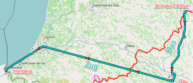 den Bus von Aire-sur-l‘Adour nach Pau und haben dort einen Zug nach Hendaye