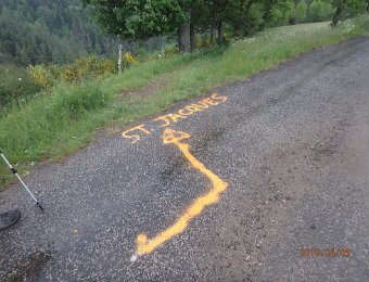 Etappe 13 von Coirolles nach Tencewieder ein steiler Abstieg und Aufstieg dabeinicht immer ist der rechte Weg der Rechte Wegdiese Markierun ist unübersehbar, hoffentlich kein Scherzwir queren den Bach St-Julienauf Grund des Regens - Rutschgefahrtiefer Waldboden