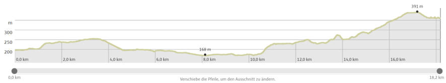 Zuerst ging es leicht bergauf und nach knapp 3,5 Kilometer wieder abwärts in die